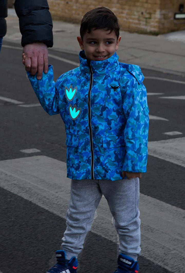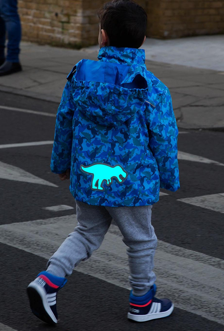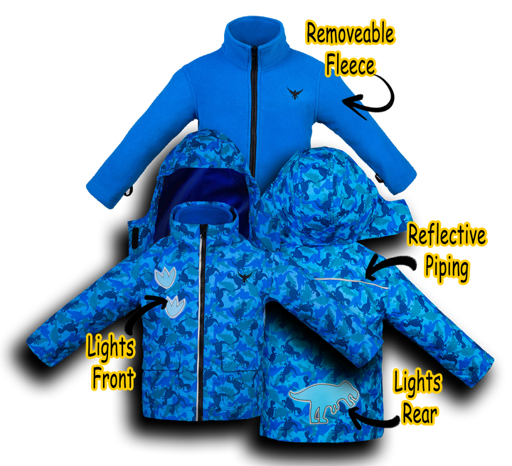 Manteau LumiCoat™ 3 en 1 à motif dinosaure bleu avec polaire intérieure amovible. Peut être porté de trois façons :