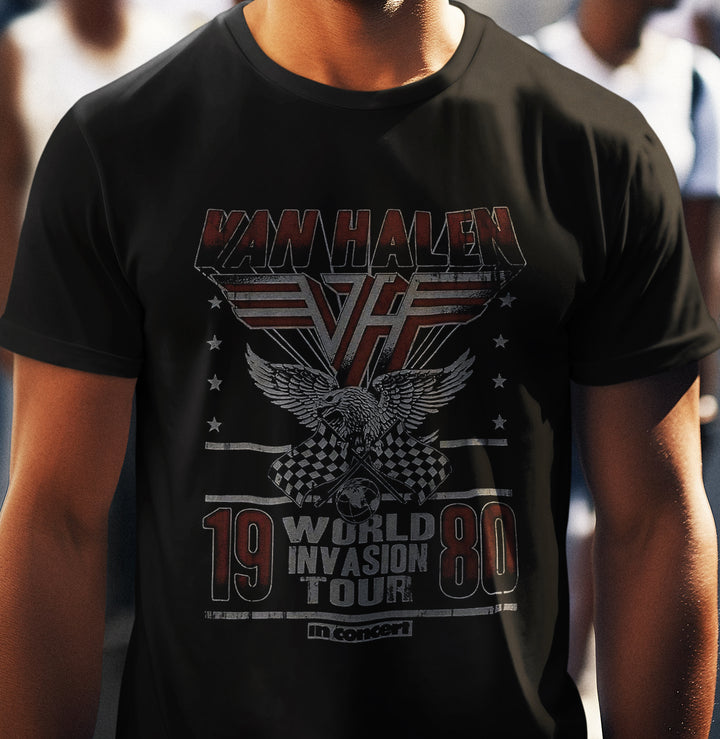A vintage piece of rock history, Van Halen's 1980 World Invasion Tour. A brilliant shirt for any festival lovers. Suitable for men, women and kids.